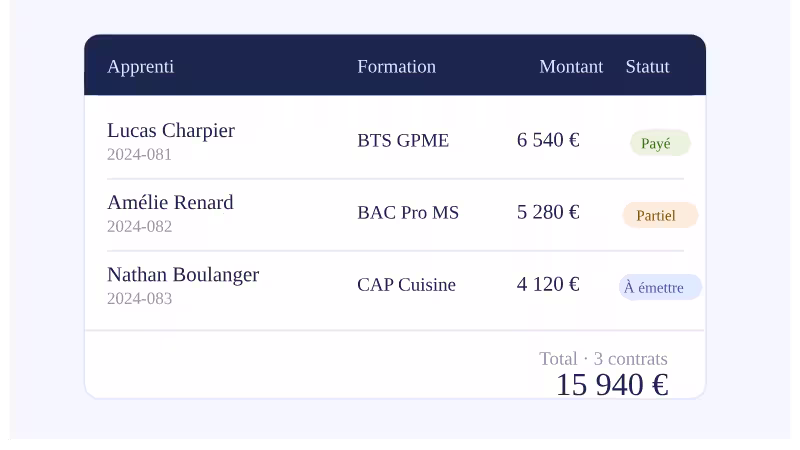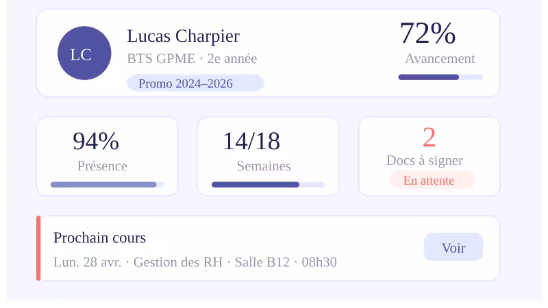 La dématérialisation du processus contractuel libère les équipes administratives des allers-retours papier avec les employeurs. Les CERFA ne sont plus saisis manuellement mais générés depuis des données déjà vérifiées. Les relances de signature sont visibles en temps réel, et les dossiers transmis aux OPCO sans aucune intervention supplémentaire.